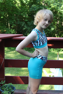 I then did the same for L - however for her I left out the separate colour down the side and made the waistband angle to a V in the front and back. The wasitband is done in a patterned fabric and the rest of the shorts in a plain turquoise. I then had to figure out what sort of top I wanted for her. In the end we decided on a sort of crop top. I took her tank top pattern that is a bit too small, took about 3/8" out of the center front and back seams and cut it off at mid torso. The arm holes I scooped in quite a bit at the back and the neck I did in a V front and back. I added 1" elastic inside the bottom band to keep everything in place.