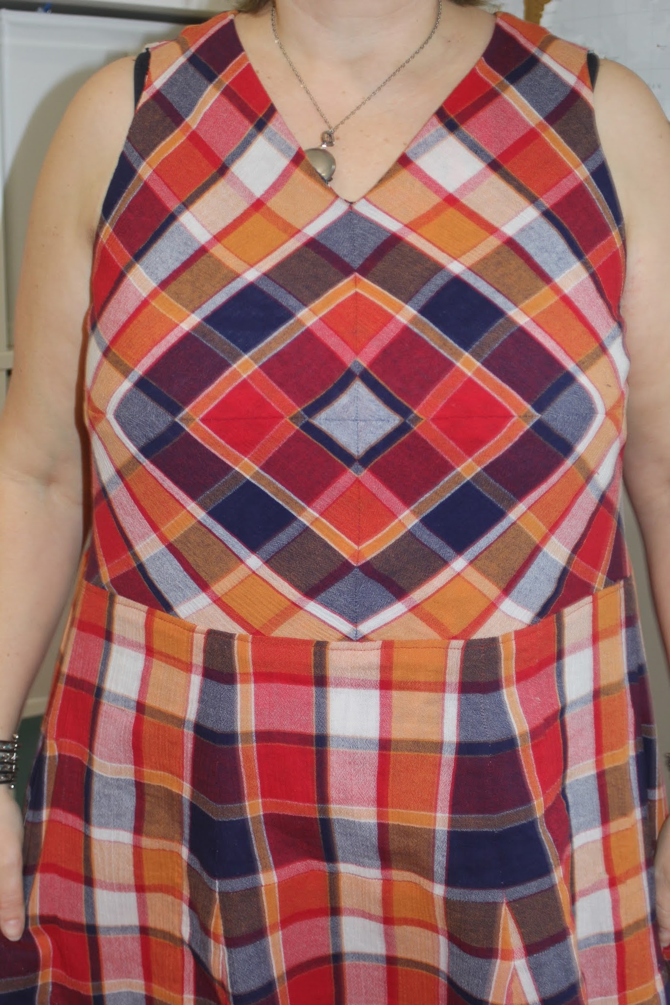 Finally the decision was made that I should go for the red, orange, white and Navy plaid crinkle gauze cotton in a summer dress with a geometric design at the front bodice.